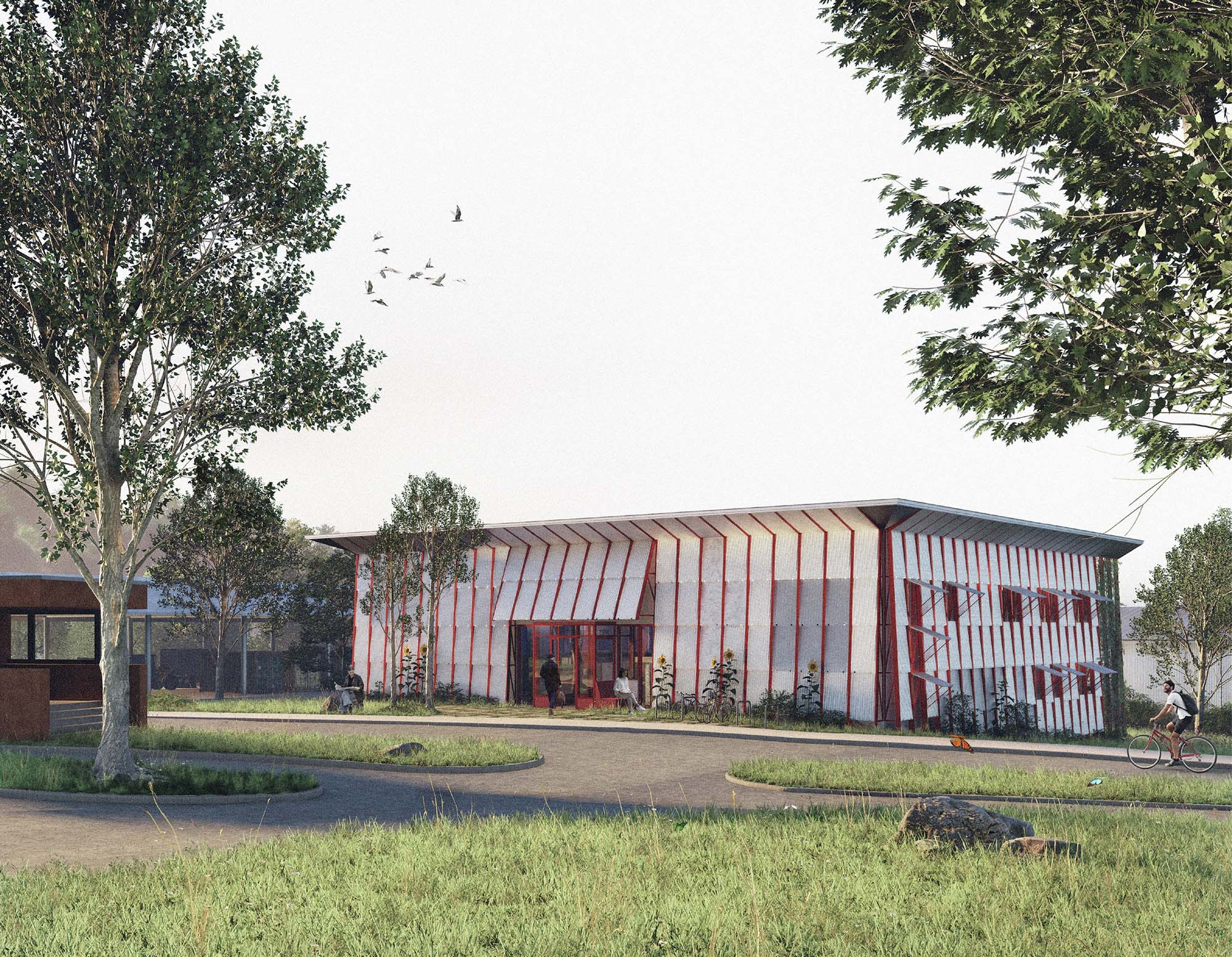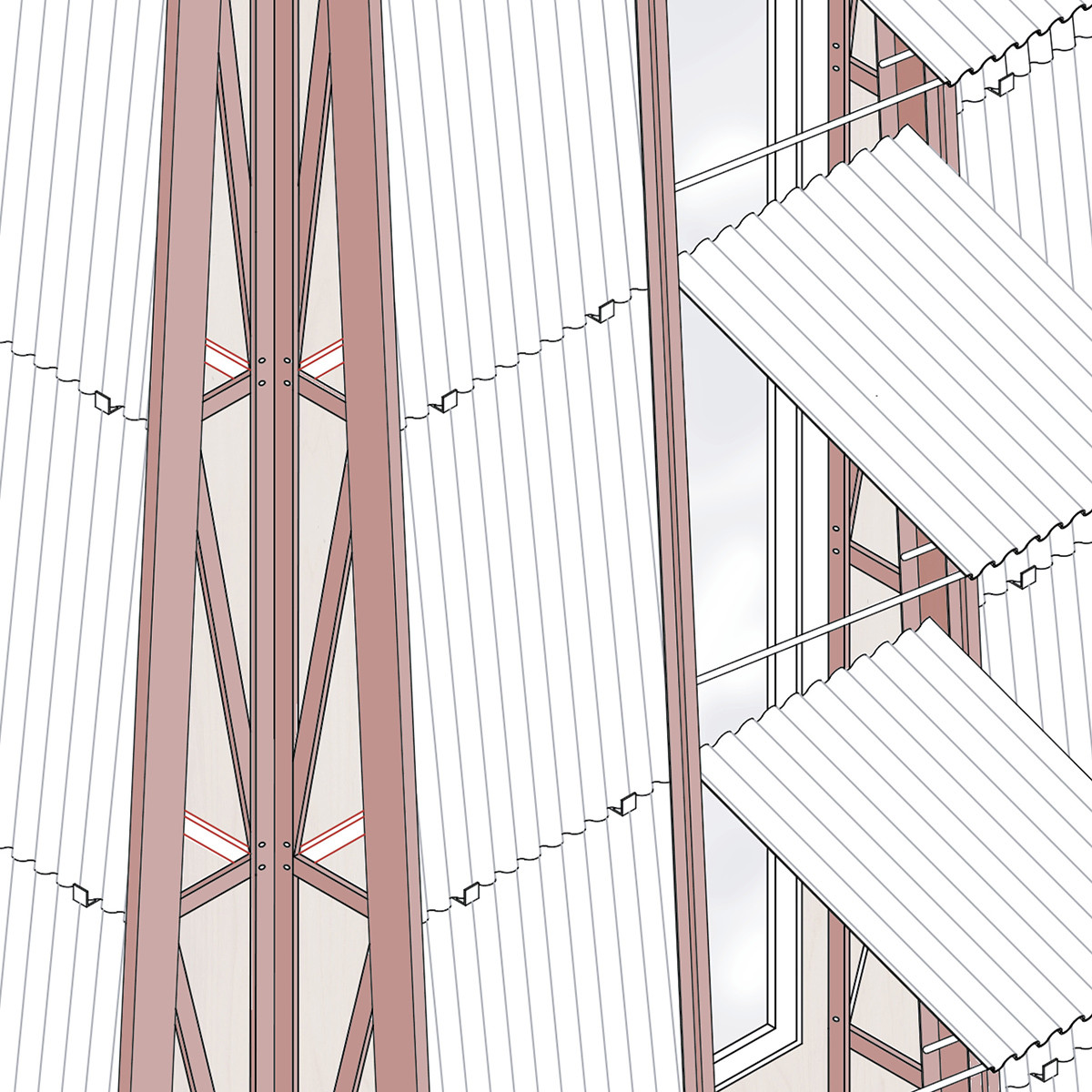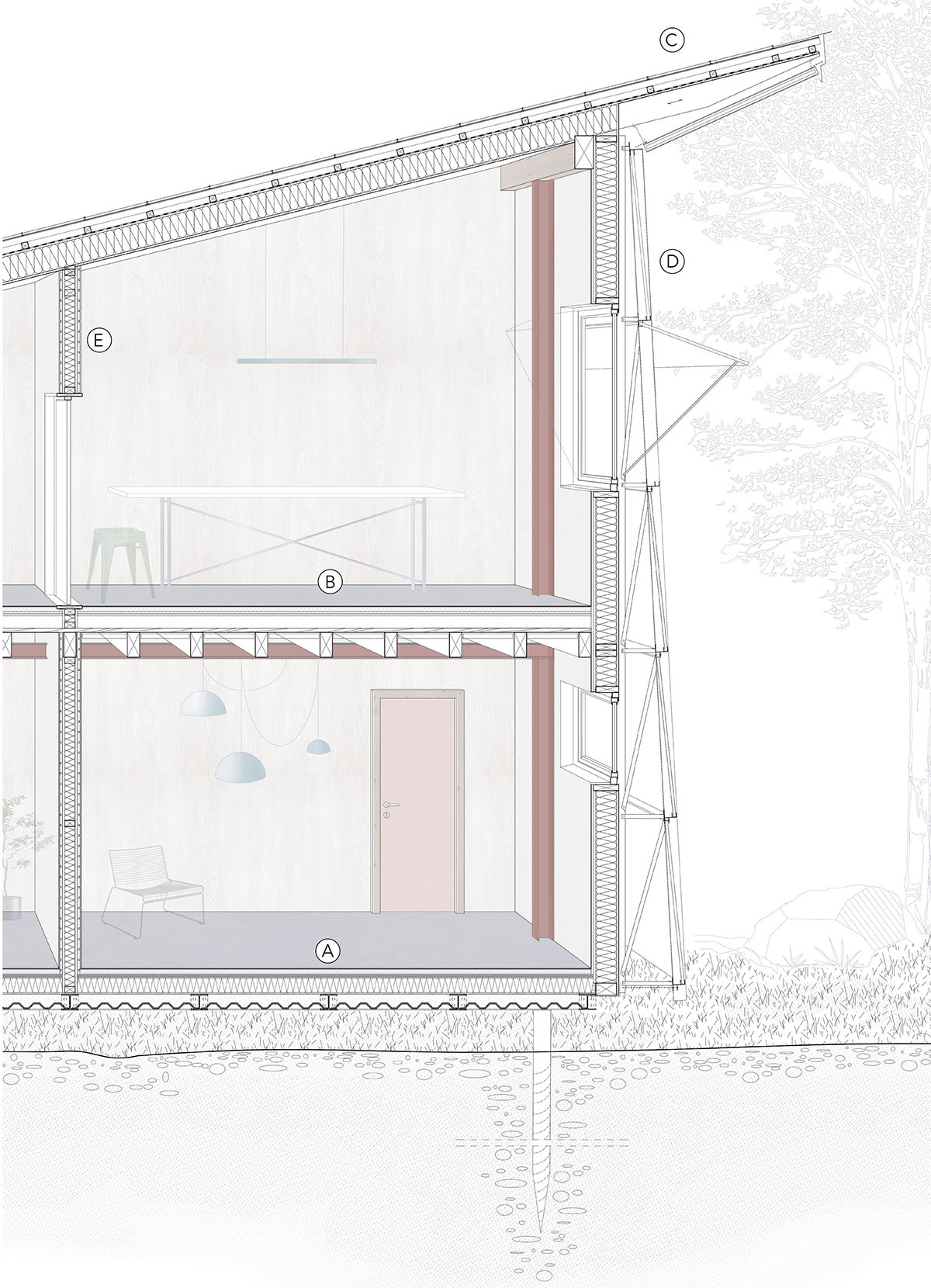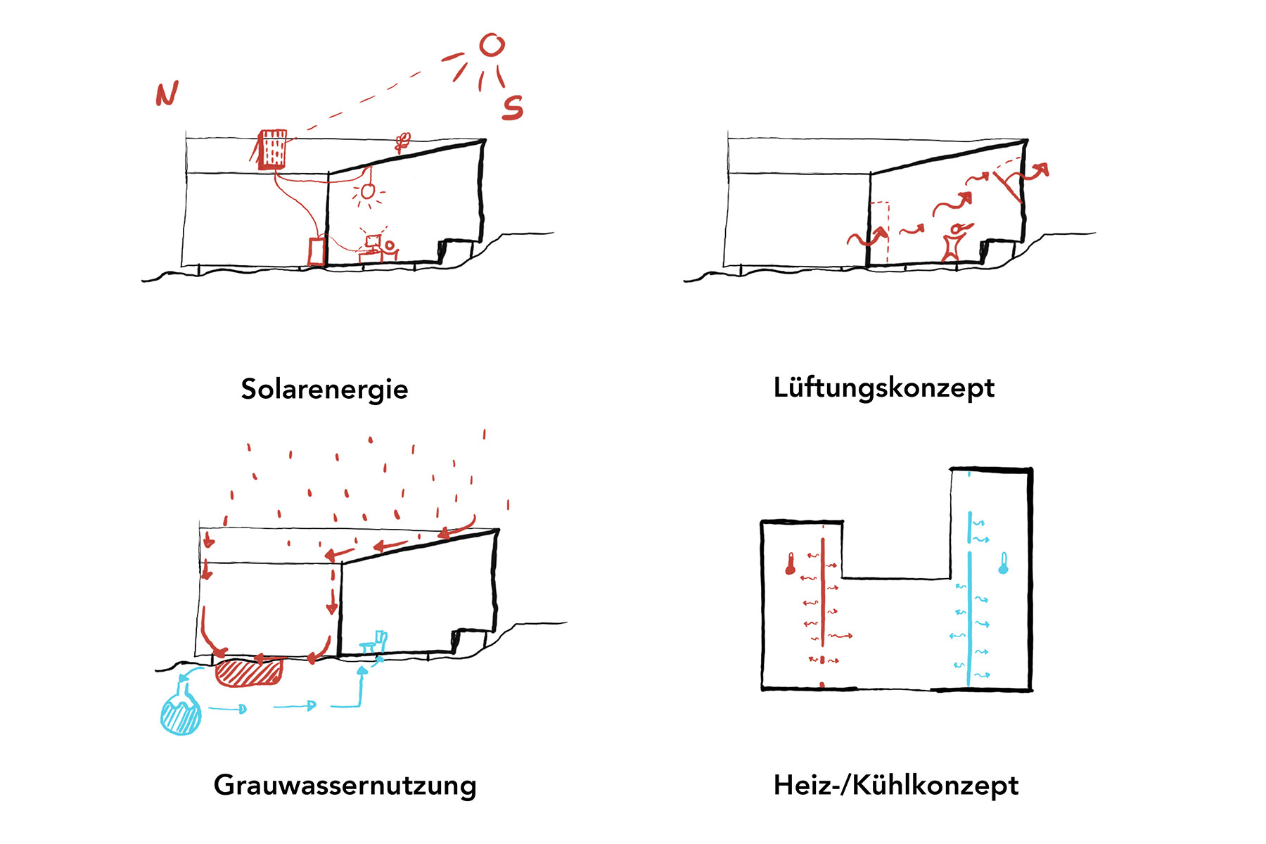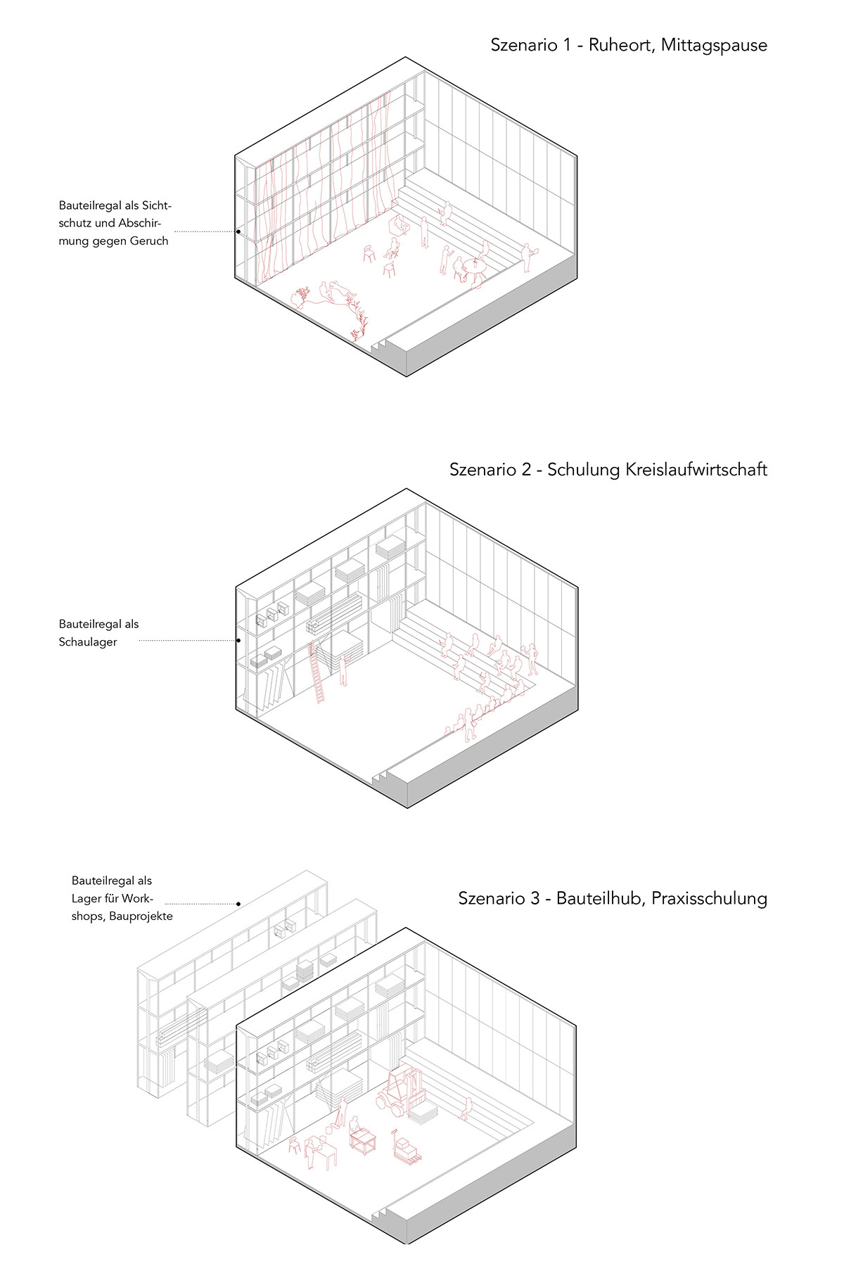 The technical concept emphasizes robustness and passive performance. Natural ventilation, visible service lines, and activated wall surfaces maintain a stable indoor climate. Photovoltaic panels and green roofing improve energy balance and microclimate. The façade consists of demountable elements that can be replaced depending on available materials.