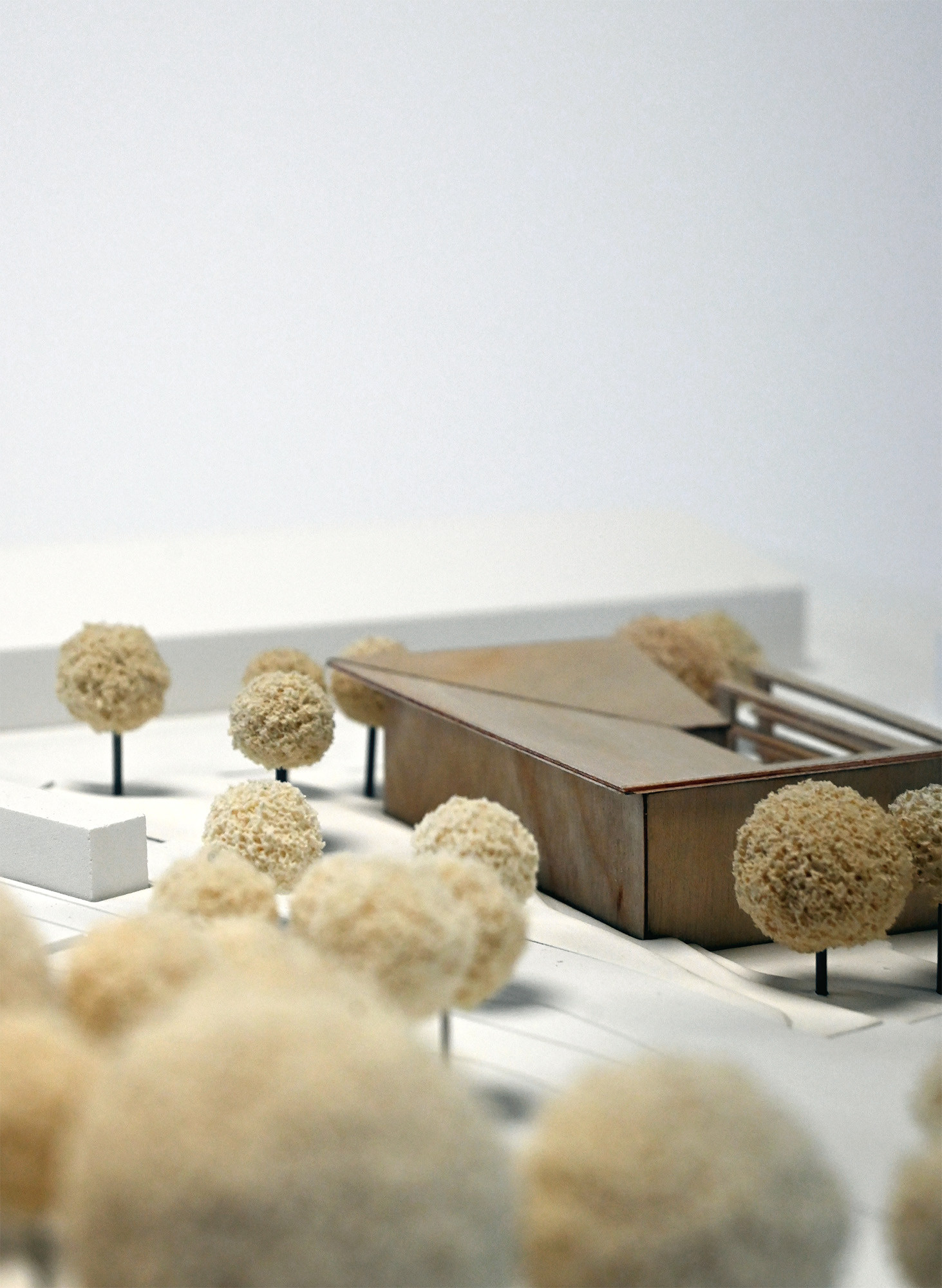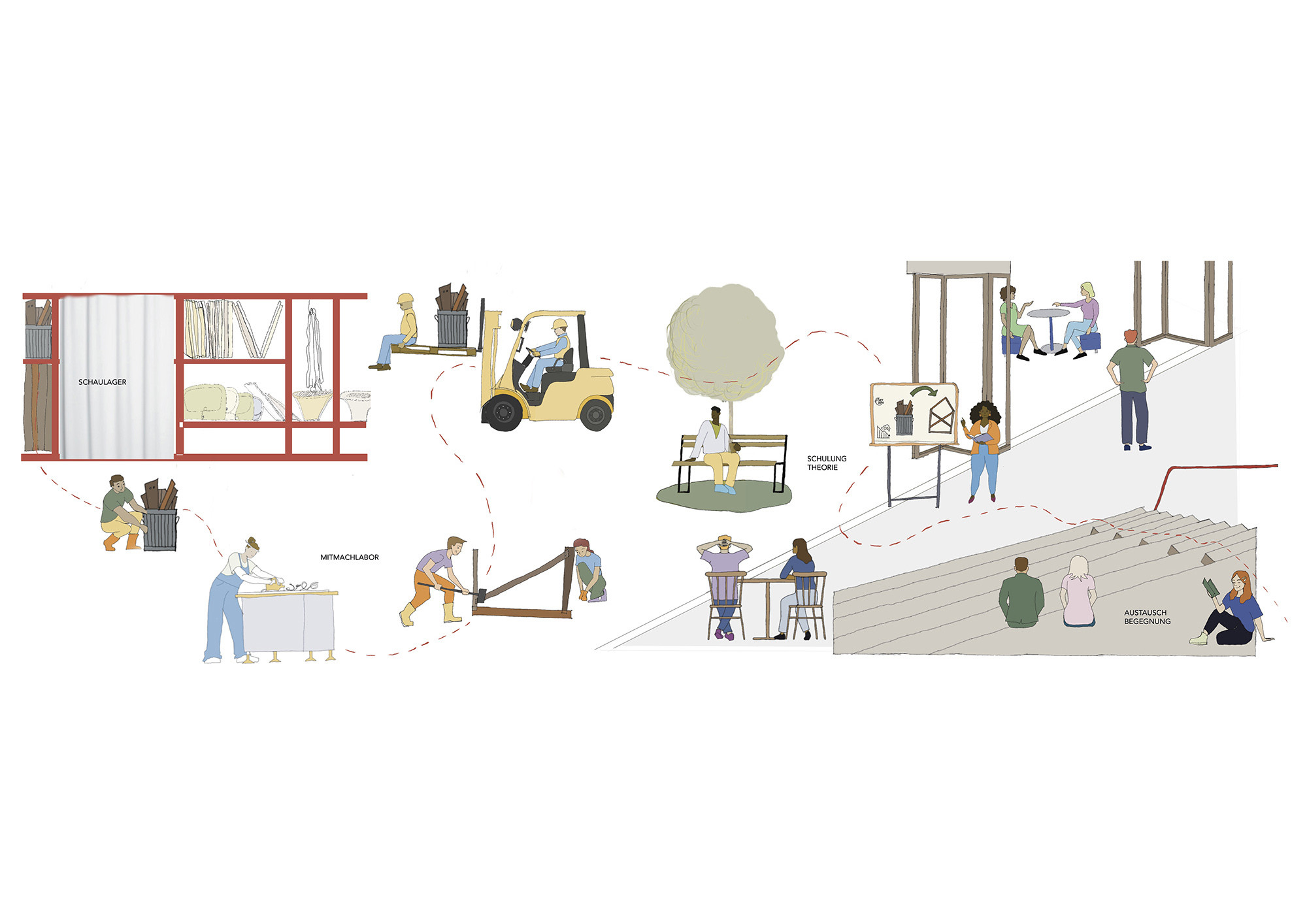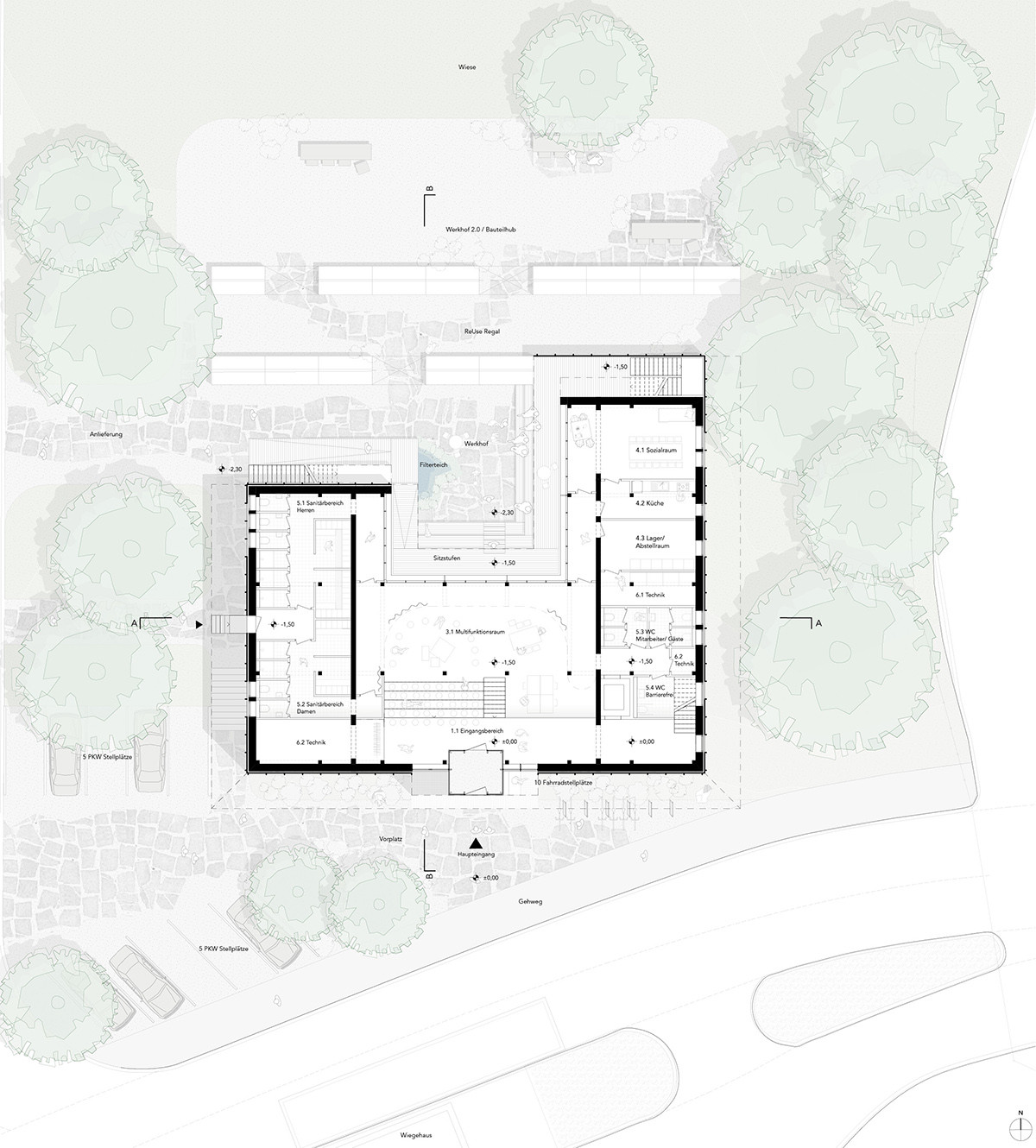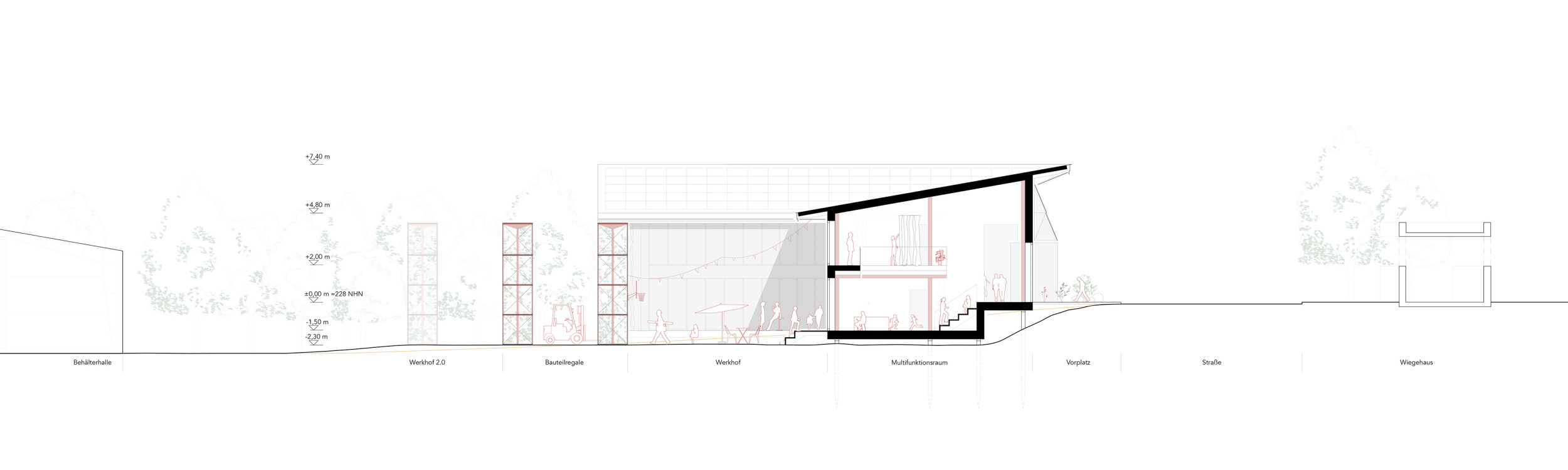 The exterior space respects the natural topography. An open entrance area with gravel surfaces, seating rocks, pioneer vegetation, and tree clusters leads to a courtyard that serves as a workshop, social space, and exhibition area. A large material shelf displays sorted components and encourages creative reuse. A wooden grandstand connects different levels and enhances the quality of stay.