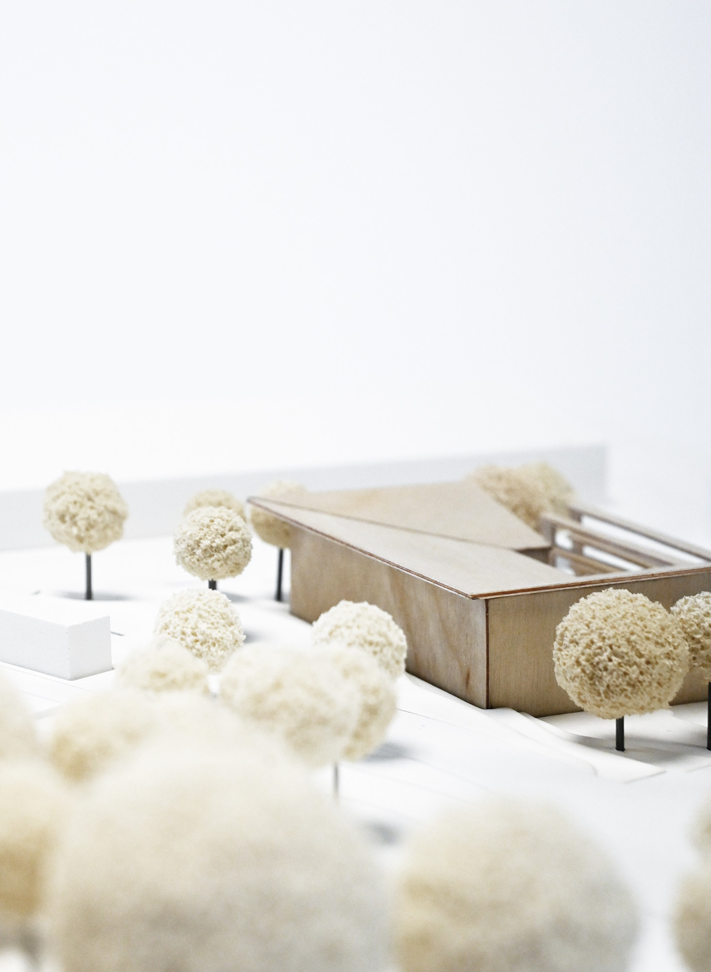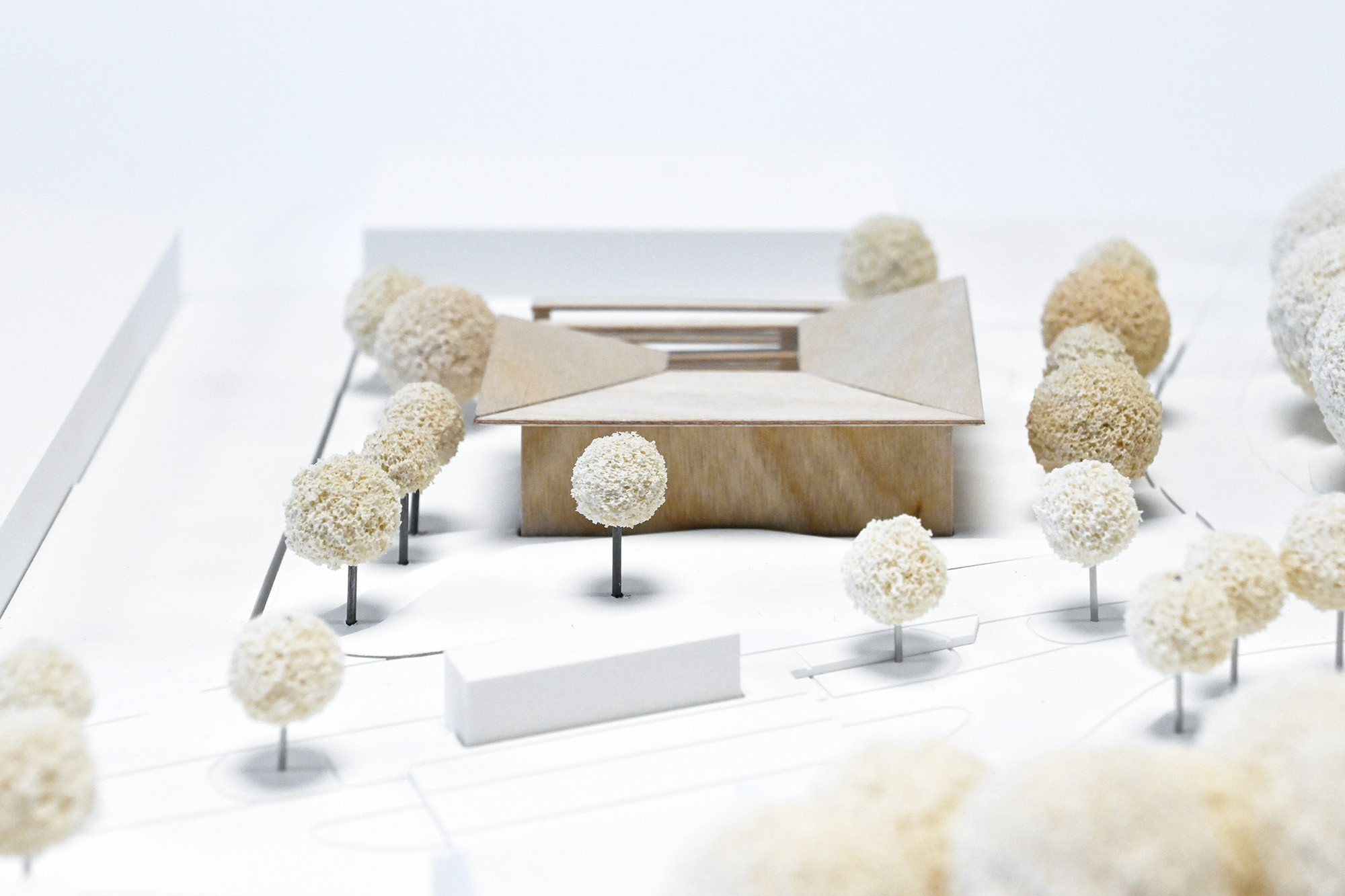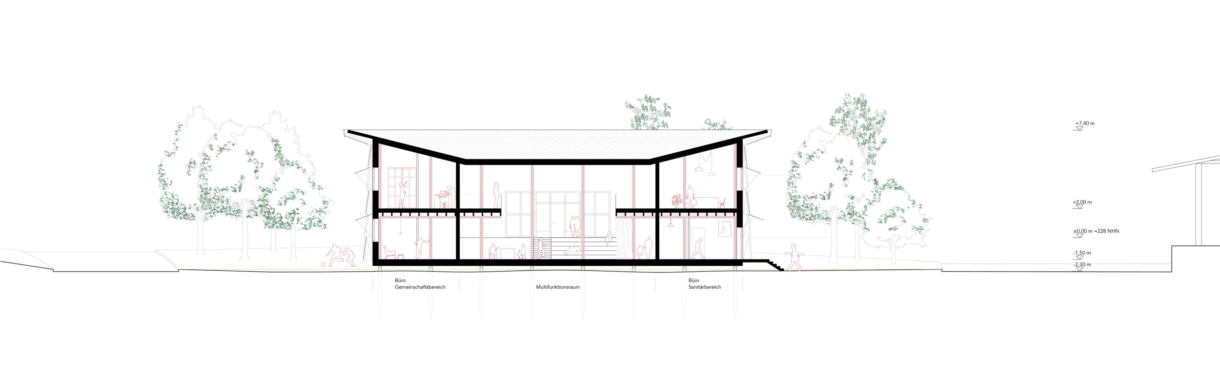 The central multifunctional room is highly flexible. It can be darkened and subdivided with curtain systems. Steps from the foyer lead into the interior, fostering an informal atmosphere. Two functional side wings accommodate offices, technical areas, sanitary facilities, and storage rooms. Movable walls allow for variable room configurations and support adaptability.