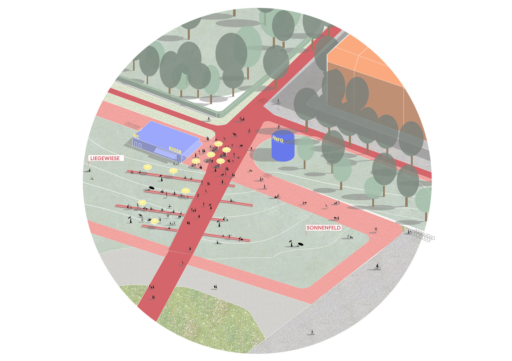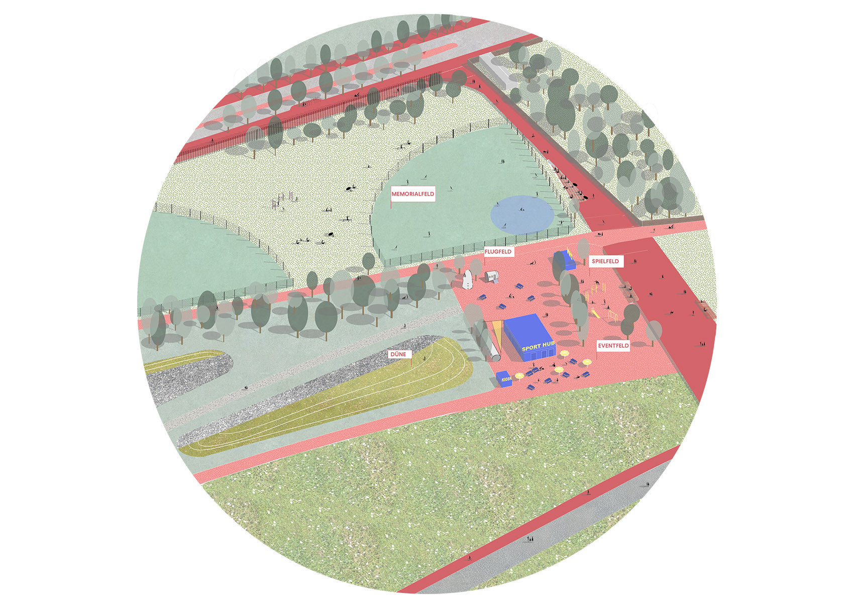 Four well-designed access points will connect the field to the surrounding neighborhoods via “piers,” creating new viewpoints and places to linger. A strengthened north-south axis will better integrate the field with the city and link it to the new “Südflanke” district. This mixed-use, low-car neighborhood will be developed on existing sealed surfaces through targeted densification, providing urgently needed housing without affecting the field itself.