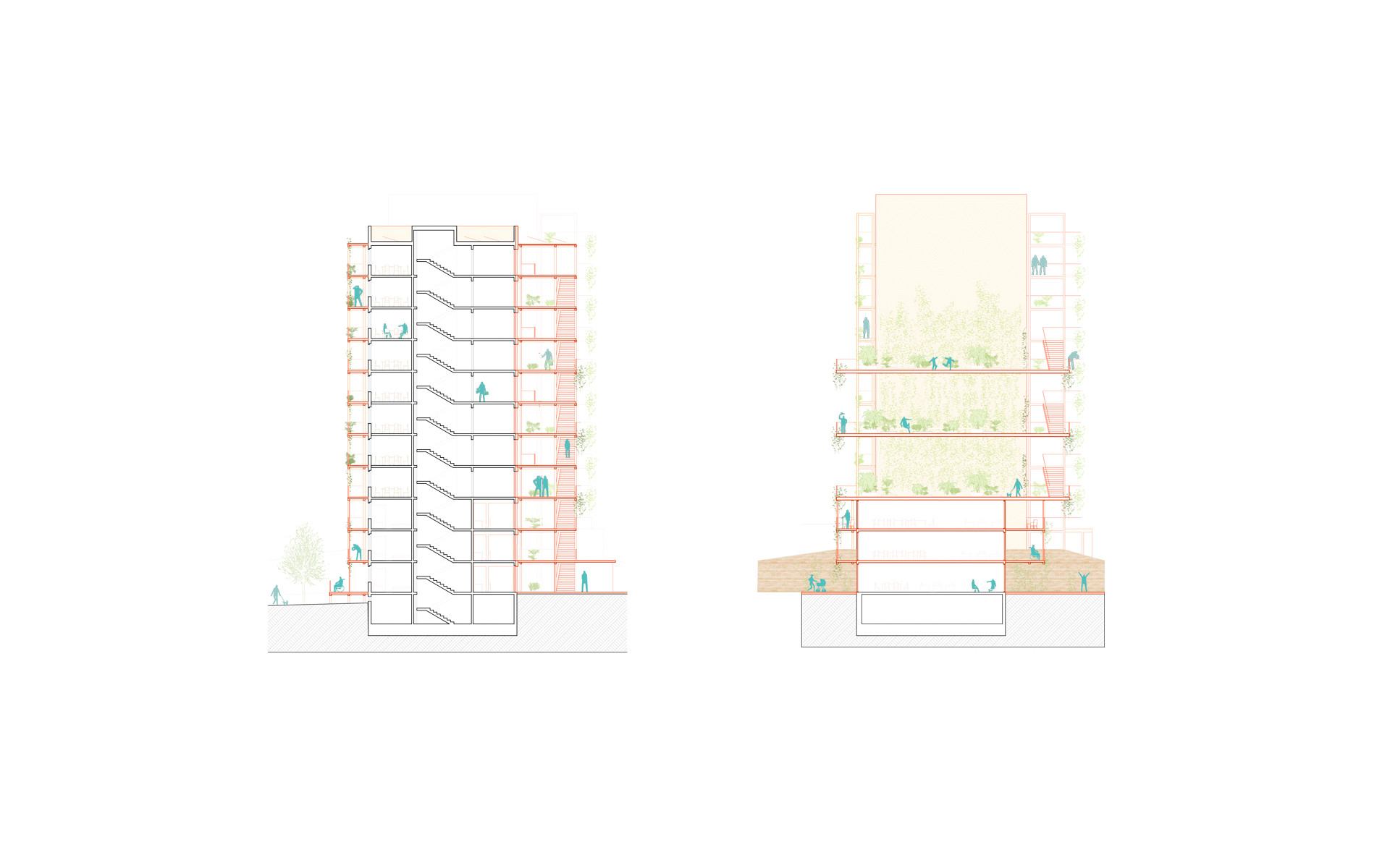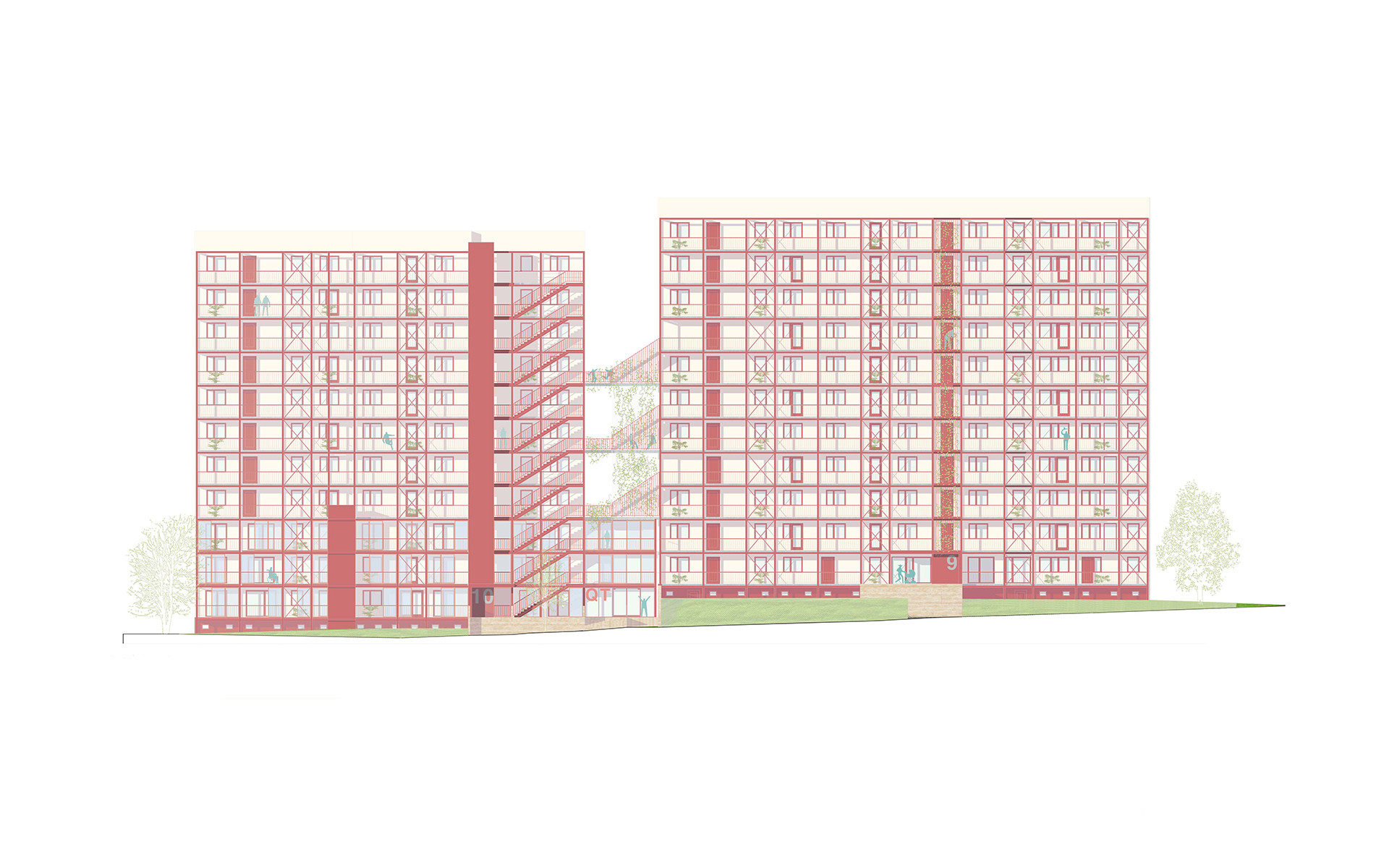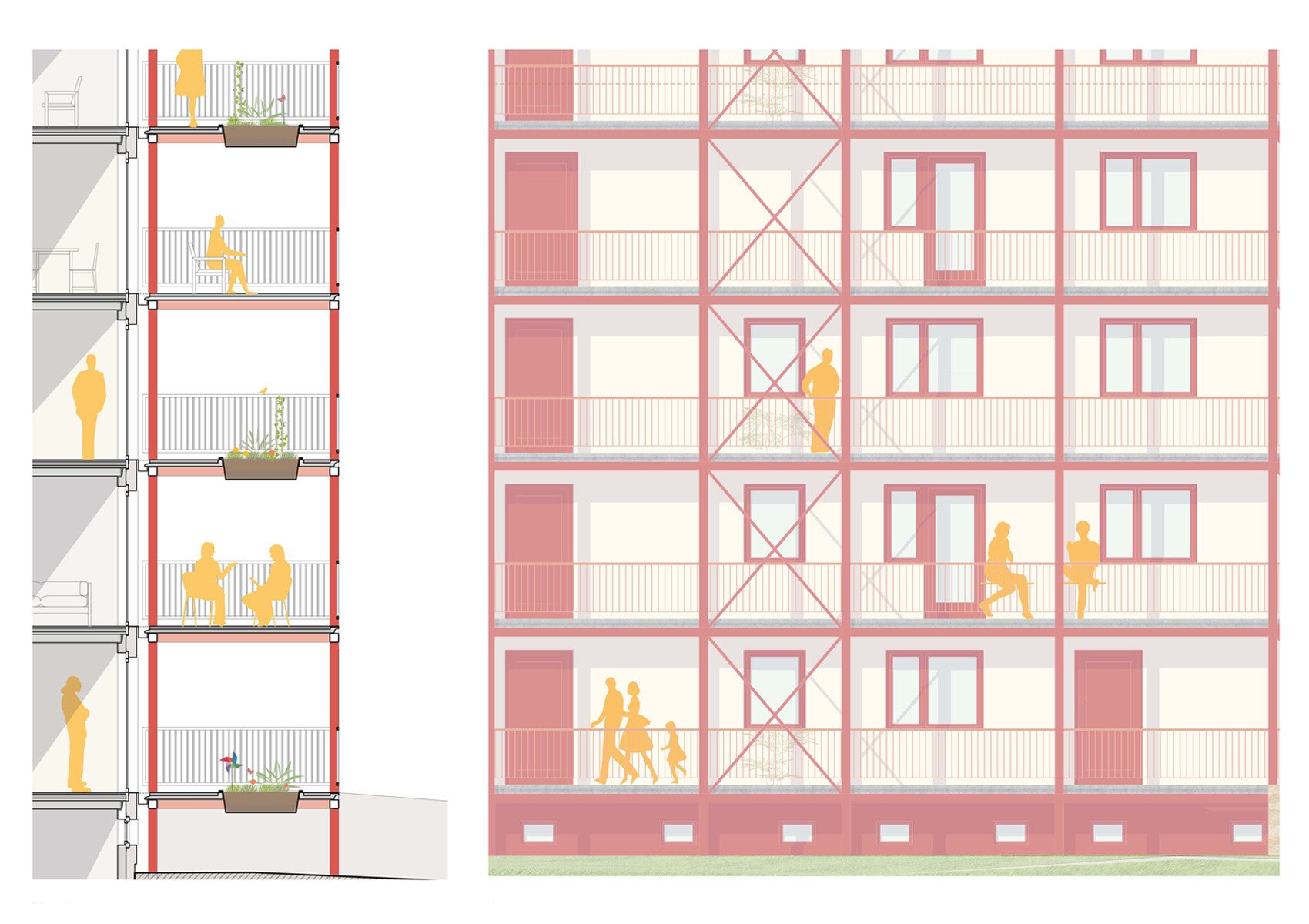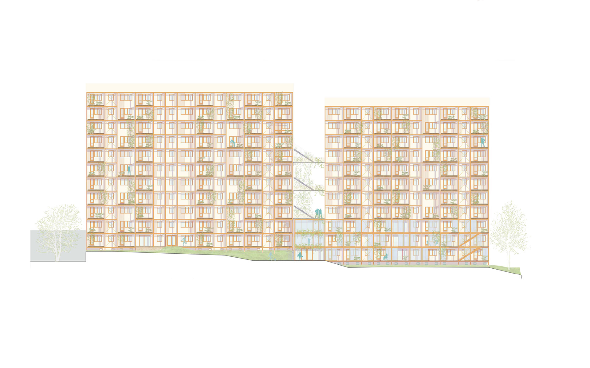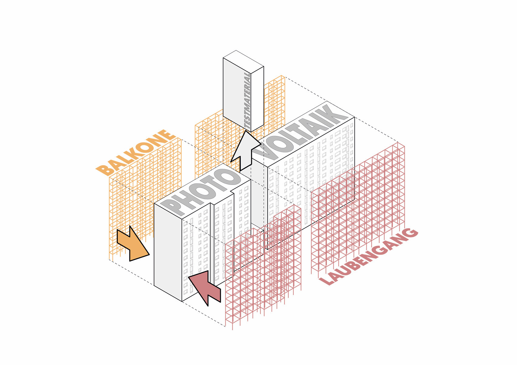 Beidseitig ergänzen neue, freitragende Stahlstrukturen das Bestandsgebäude. Sie nehmen Balkone und Laubengänge auf und schaffen geschützte Erschließungszonen, die den Rhythmus der bestehenden Tragstruktur respektieren. Die Dachflächen sowie die Oberseiten der neuen Bauteile werden zur Energiegewinnung durch Photovoltaik genutzt. Die Fassadenelemente und Wetterschalen des Bestands werden als Bodenplatten und Witterungsschutz wiederverwendet – so bleibt der Materialkreislauf geschlossen.