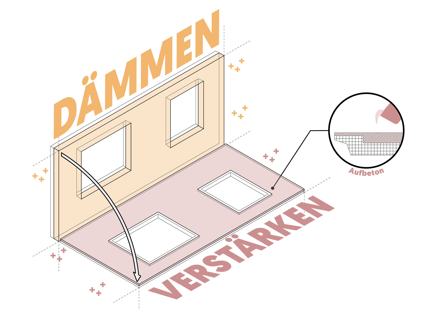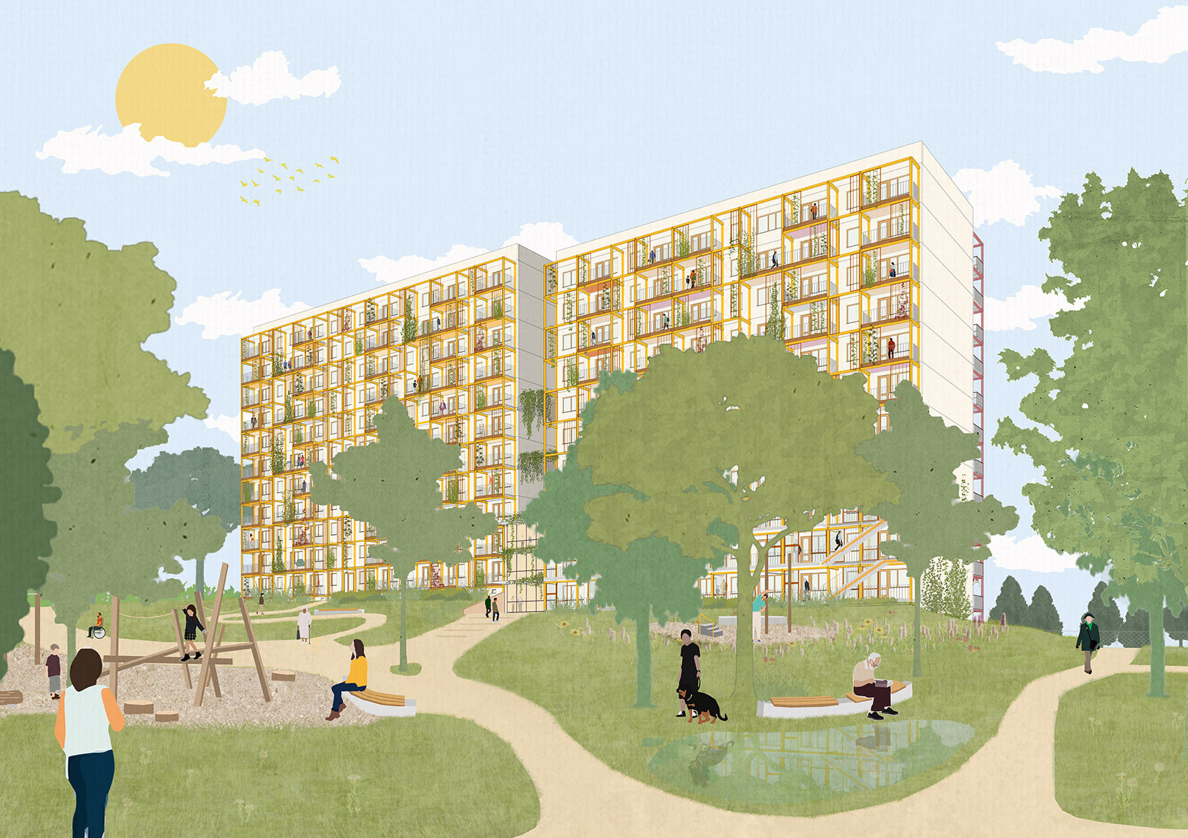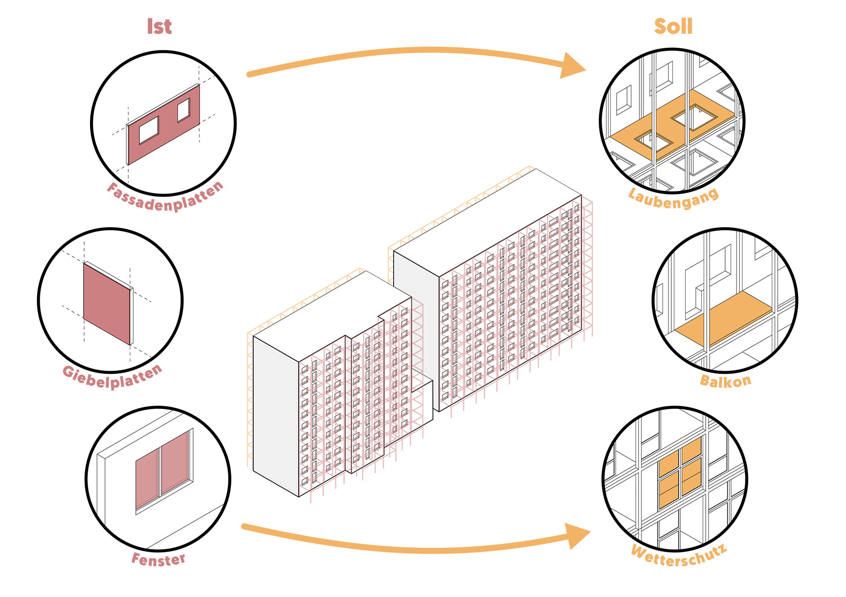 Der Wettbewerbsbeitrag in Zusammenarbeit mit asp Architekten würdigt das bauliche Erbe des DDR-Wohnungsbaus und zeigt, wie serieller Bestand zukunftsfähig weitergedacht werden kann. Im Zentrum steht der respektvolle Umgang mit der vorhandenen Substanz und die konsequente Umsetzung des zirkulären Bauens. Das Gebäude wird als Materiallager verstanden: Bauteile werden sorgfältig rückgebaut, geprüft und in neuer Funktion wiederverwendet. So entsteht aus dem Vertrauten etwas Neues, das die Geschichte des Hauses lesbar hält und zugleich aktuelle Anforderungen an Nachhaltigkeit und Gemeinschaft erfüllt.
