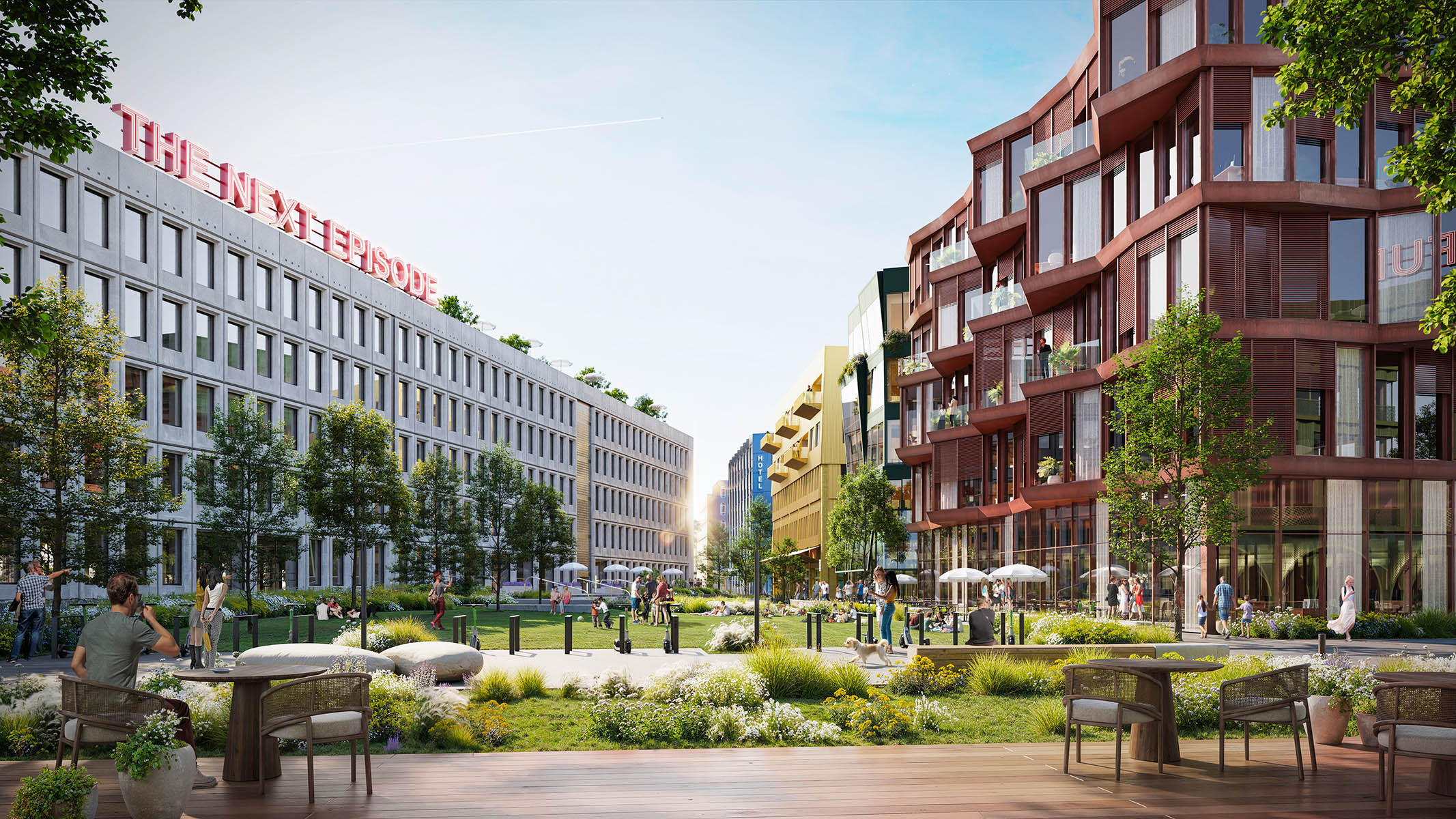 Die Station E von LXSY markiert den Eingang zum Quartier. Eine elegant gewellte Metallhülle mit Volants umspielt die oberen Geschosse wie ein fließendes Gewand und verleiht dem Baukörper Leichtigkeit und Bewegung. Der Sockel aus ReUse-Backstein kontrastiert mit der dynamischen Fassade und erinnert an die industrielle Architektur Berlins. Diese Materialkomposition aus wiederverwendetem Metall und Ziegel folgt den Prinzipien des zirkulären Bauens und bringt die Idee nachhaltiger Transformation ins Quartier. Das offen gestaltete Erdgeschoss lädt zur urbanen Interaktion ein. Station E macht zirkuläres Bauen zum optimistischen Statement – eine Verbindung aus industrieller Coolness, urbaner Lebendigkeit und neuer Ästhetik der Nachhaltigkeit.